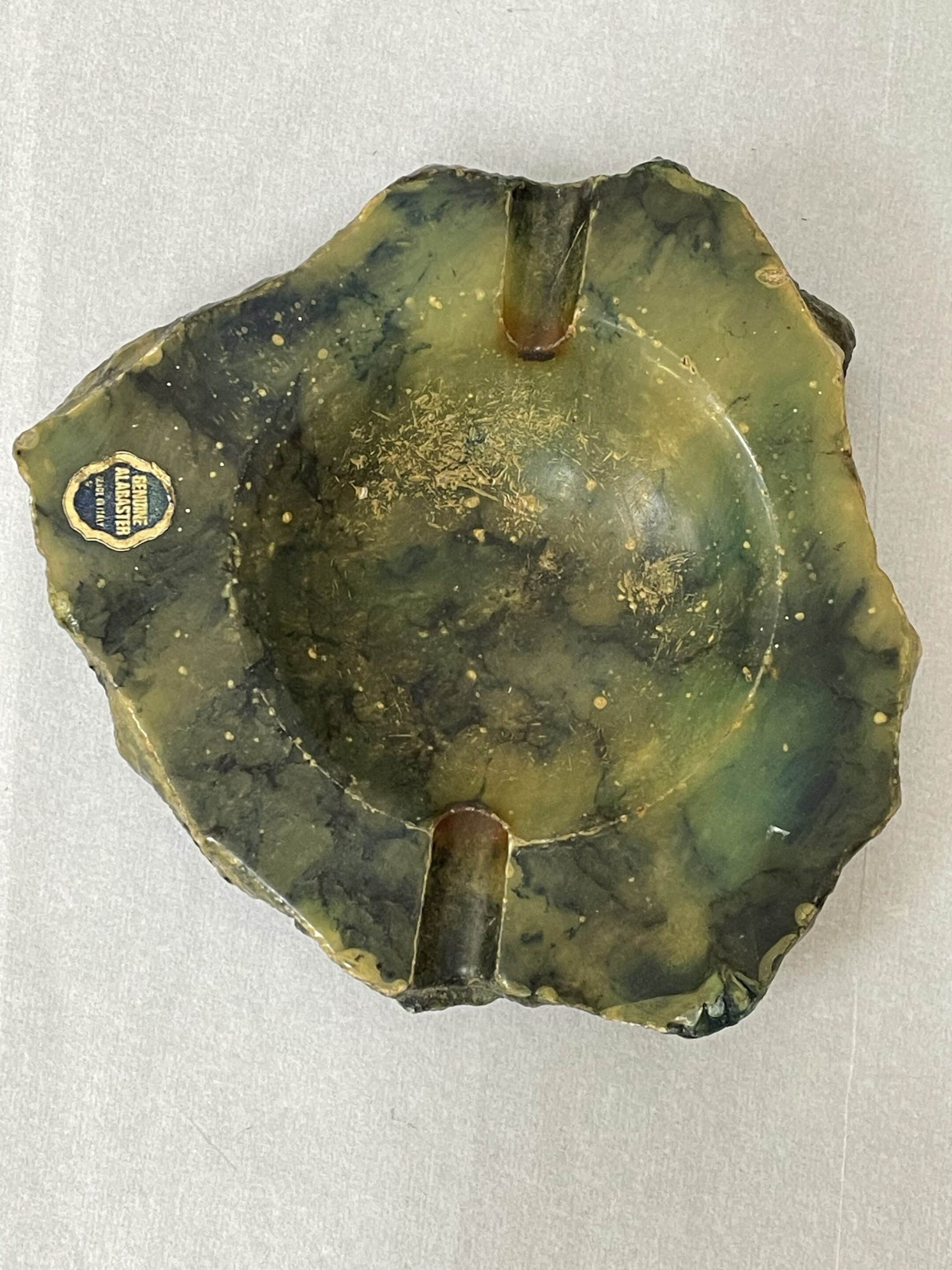 Vintage alabaster ashtray from the 1950’s. hand carved in Italy, From the Volterra region. This piece speaks of status and fashion. A stunning dark green and blue vein through the stone, makes it sought after and desirable. It does have some staining and wear from age and use, but is to be expected in something this age and is reflected in the price.