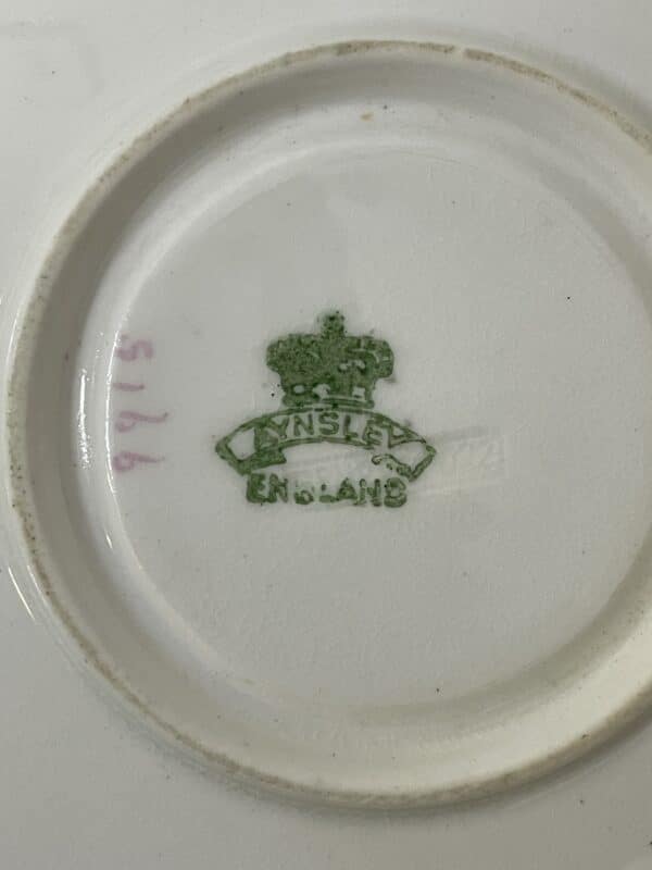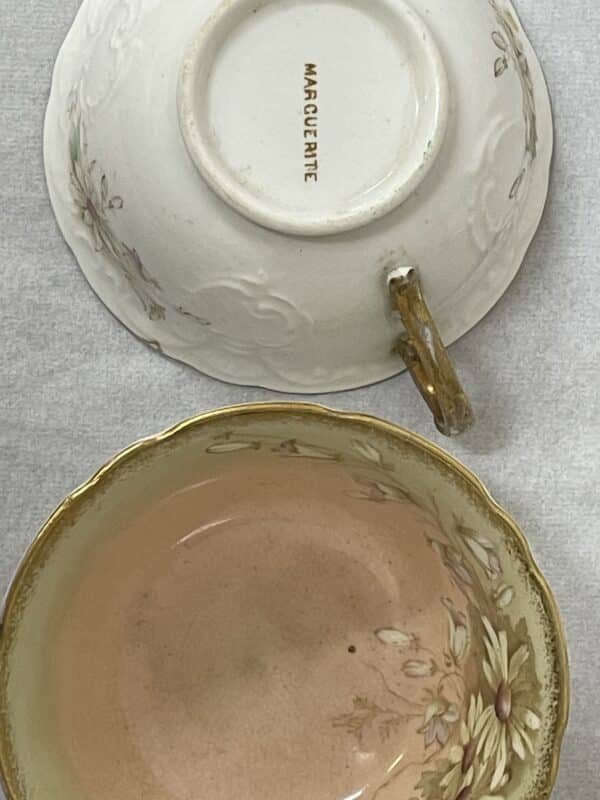 This vintage Aynsley English fine bone china tea set is the Marguerite pattern, and the back stamp dates it to 1925-1934. The registration number speaks of the embossed (raised) pattern in the china. The floral paper daisy pattern, marguerite, is hand painted. The base colour of the plates, saucers and cups is a light dusty pink, that spreads to a light teal and then to gold trim. The cups have gold handles also. In this set you get 7 teacups, 8 saucers and 9 cake plates. There is some wear on a few pieces, and 1 saucer, 1 cake plate and 1 teacup have a light crack. The gilt on the teacup handles show vintage wear. Very reminiscent of Limoges. A stunning collection for any fan of aynsley china.