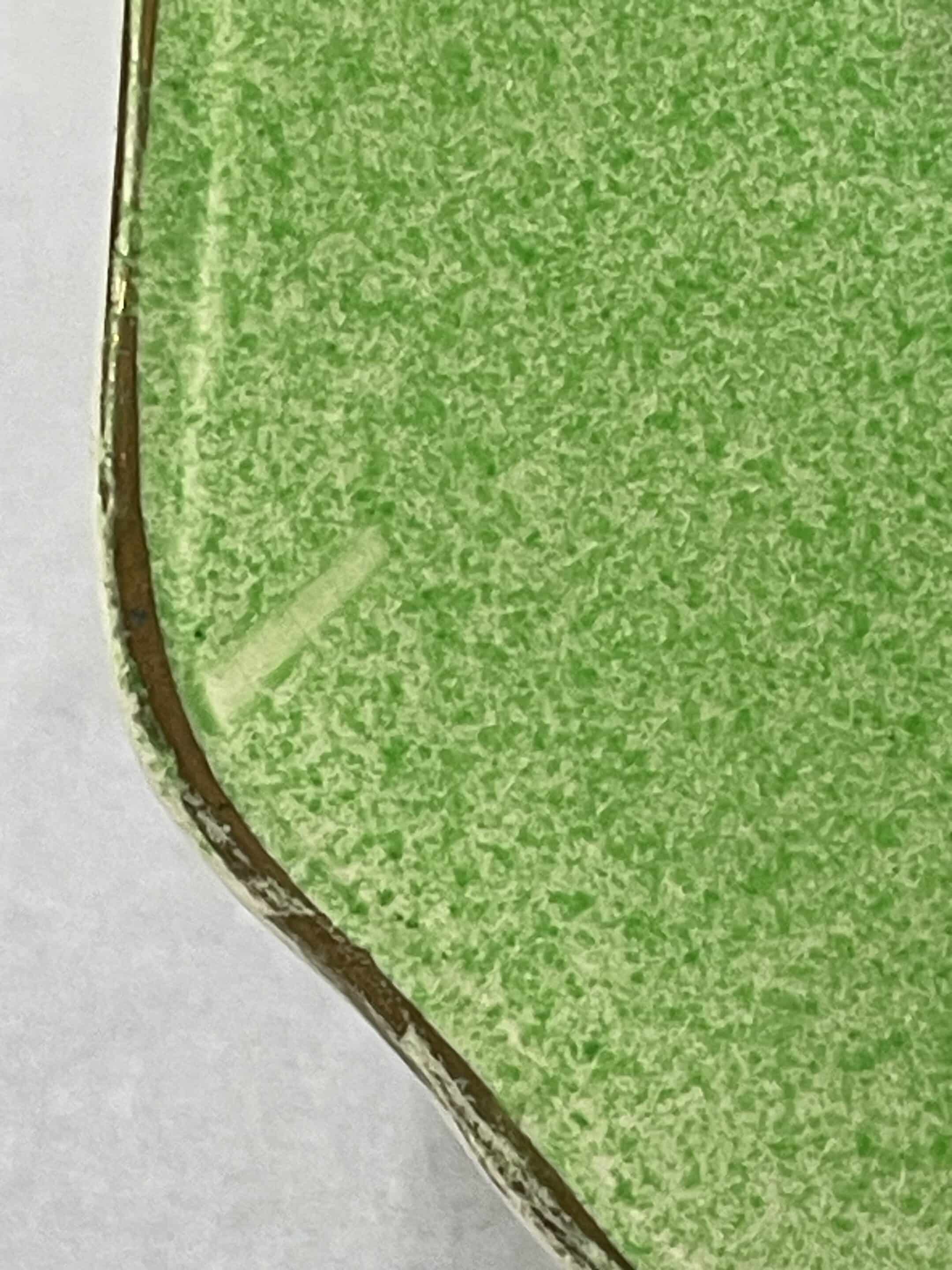 This stunning art deco green square plate is dated to 1920’s/30’s and is in amazing condition. No chips or cracks. Only crazing on the underside. The gold edging has some wear from use (You don’t get to be 100 and not show some signs of age!. It is stamped empire England Shelton ivory with the number 440 underneath. Also the makers mark in gold is next to it.
