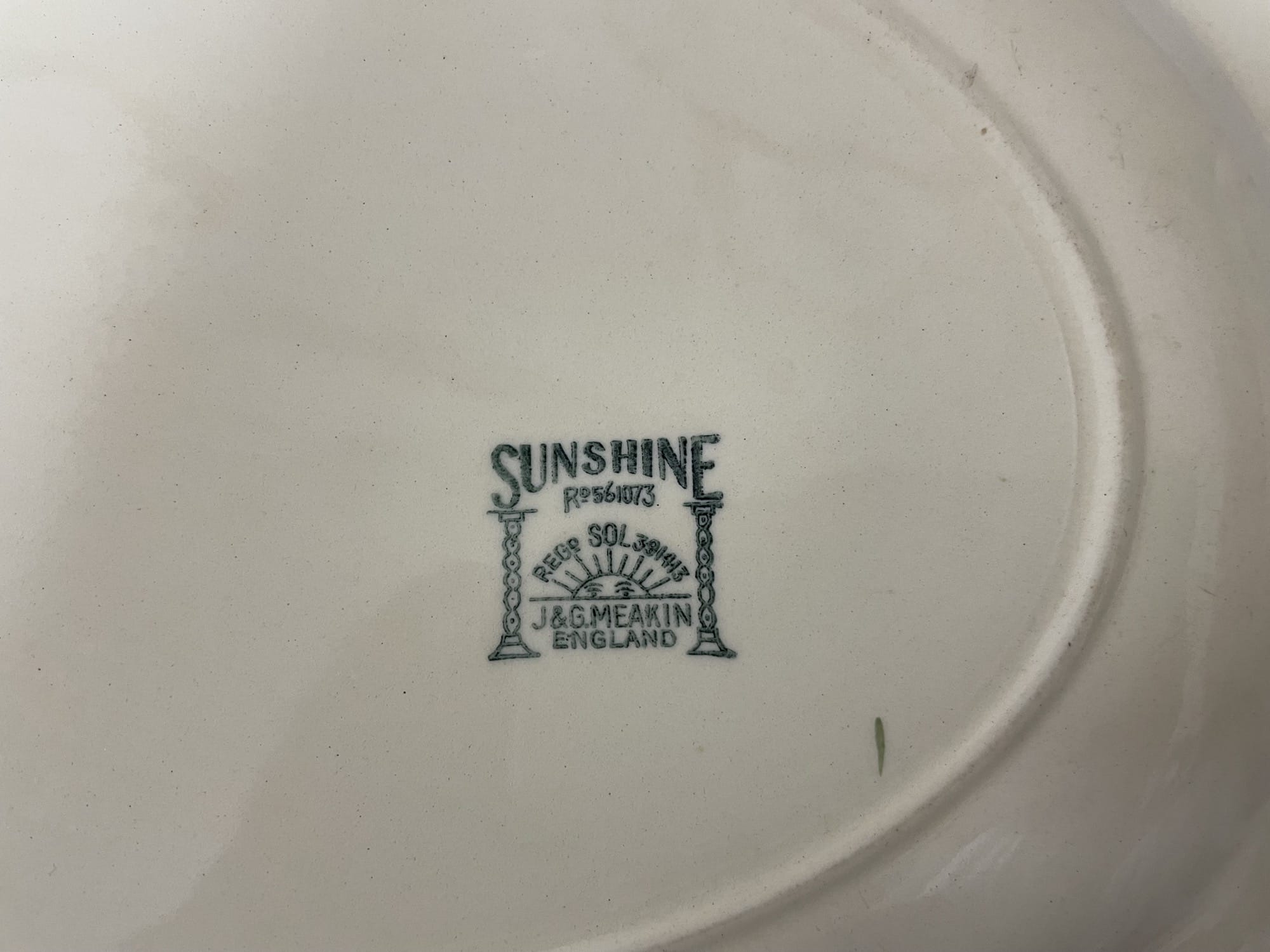J & G Meakin Sunshine Platter. A beautiful pale yellow with a floral and berry border. The gold trim is worn and faded in parts. No cracking or chips. Standard wear and tear for a vintage platter.
