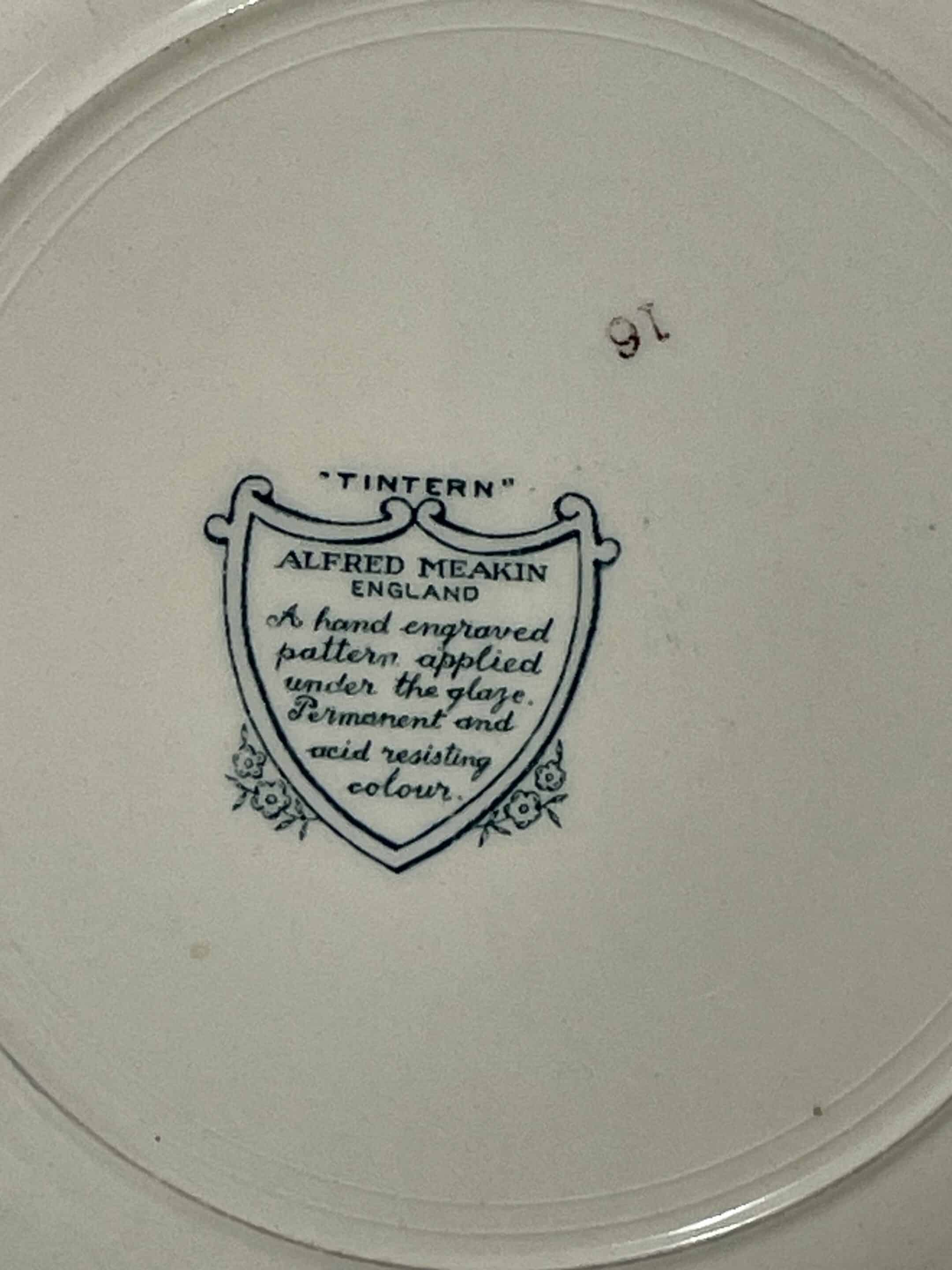 This Alfred Meakin plate is a depiction of Tintern abbey in Wales England, in green. Dating to the 1930’s/40’s. In excellent condition with no chips, cracks or crazing and only very faint cut marks in the glaze from use. They are not noticeable at all and do not detract from the elegance of the picture. A stunning decorative piece for the wall, or use as a decorative cake plate. Please see photos.